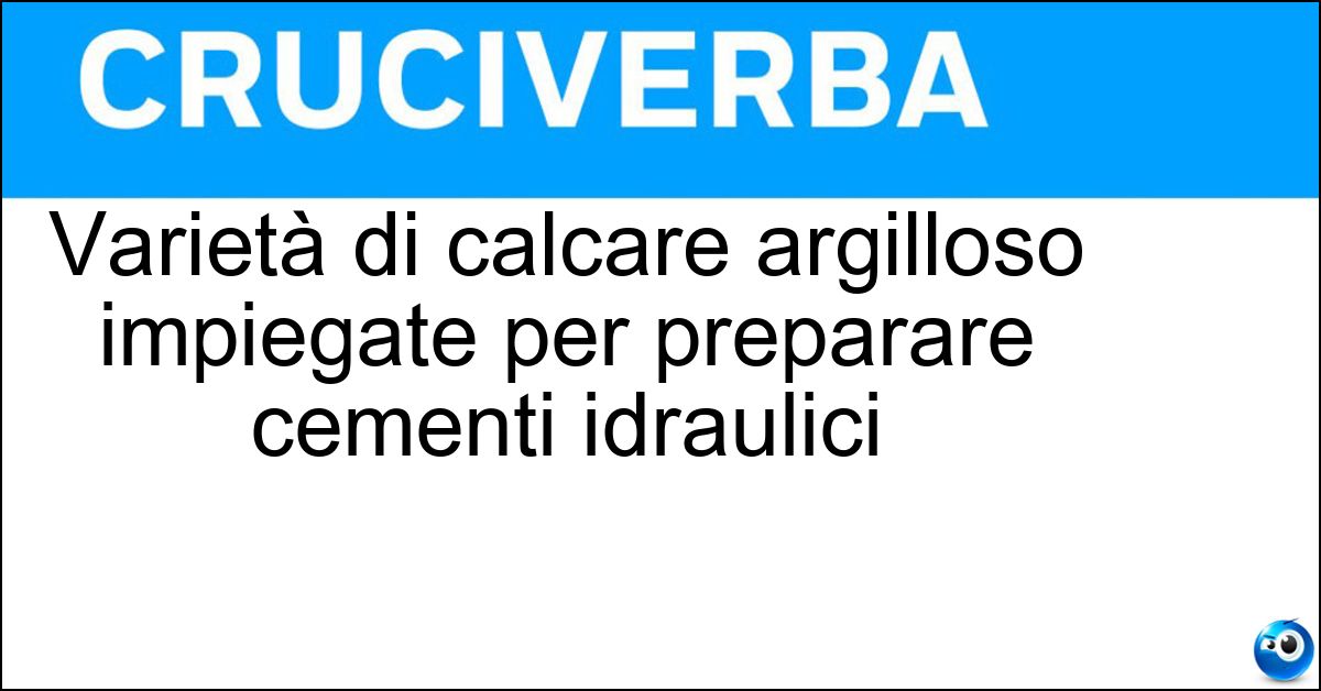 Nei cruciverba e nelle parole crociate, la definizione "Varietà di calcare argilloso impiegate per preparare cementi idraulici" corrisponde a una soluzione formata da 5 lettere. È un quesito ricorrente nel mondo dell’enigmistica, presente con frequenza sia nelle griglie stampate sia nei giochi digitali dedicati agli appassionati.