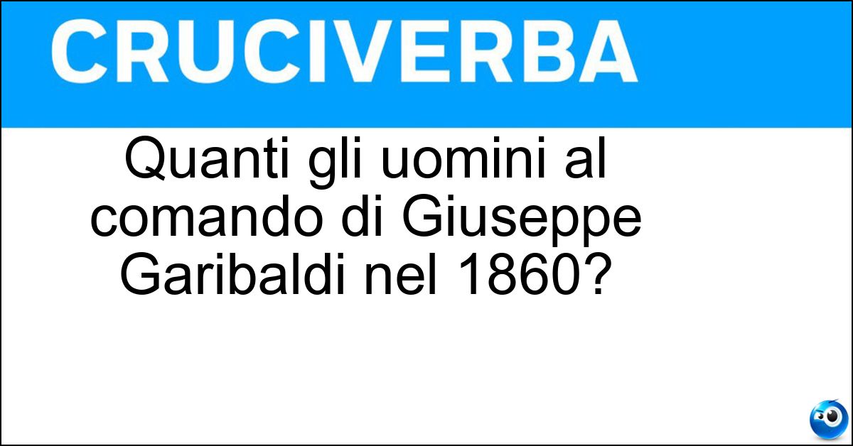 Nei cruciverba e nelle parole crociate, la definizione "Quanti gli uomini al comando di Giuseppe Garibaldi nel 1860?" corrisponde a una soluzione formata da 5 lettere. È un quesito ricorrente nel mondo dell’enigmistica, presente con frequenza sia nelle griglie stampate sia nei giochi digitali dedicati agli appassionati.