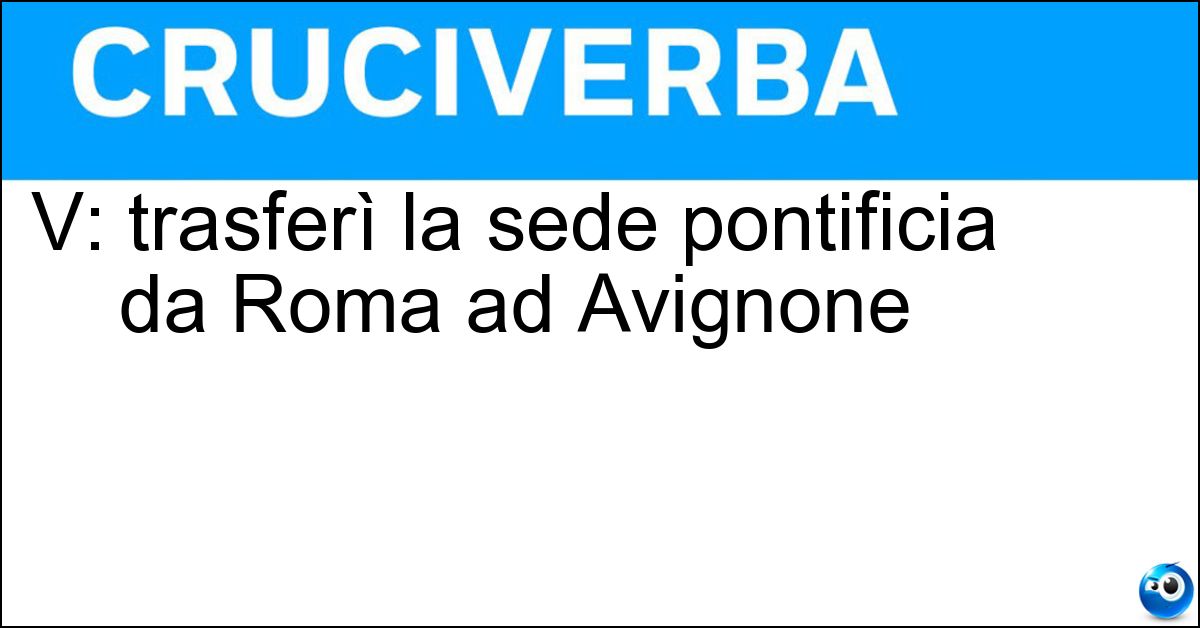 Nei cruciverba e nelle parole crociate, la definizione "V: trasferì la sede pontificia da Roma ad Avignone" corrisponde a una soluzione formata da 8 lettere. È un quesito ricorrente nel mondo dell’enigmistica, presente con frequenza sia nelle griglie stampate sia nei giochi digitali dedicati agli appassionati.