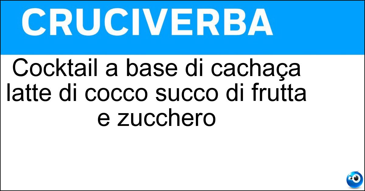 Nei cruciverba e nelle parole crociate, la definizione "Cocktail a base di cachaça latte di cocco succo di frutta e zucchero" corrisponde a una soluzione formata da 6 lettere. È un quesito ricorrente nel mondo dell’enigmistica, presente con frequenza sia nelle griglie stampate sia nei giochi digitali dedicati agli appassionati.