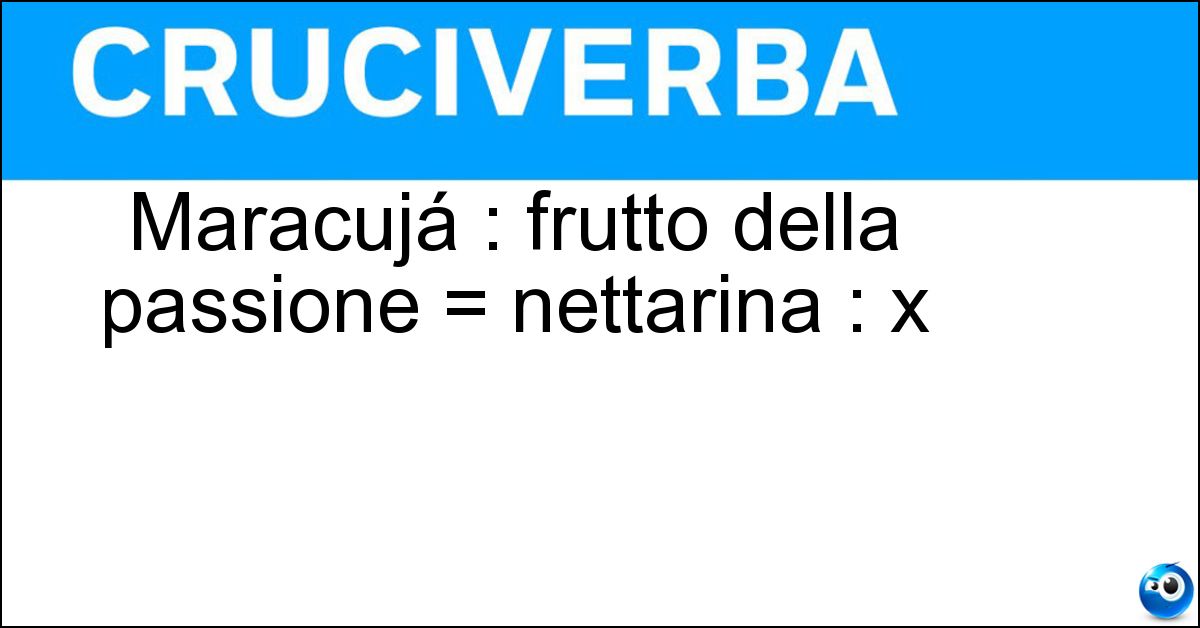 Nei cruciverba e nelle parole crociate, la definizione "Maracujá : frutto della passione = nettarina : x" corrisponde a una soluzione formata da 9 lettere. È un quesito ricorrente nel mondo dell’enigmistica, presente con frequenza sia nelle griglie stampate sia nei giochi digitali dedicati agli appassionati.