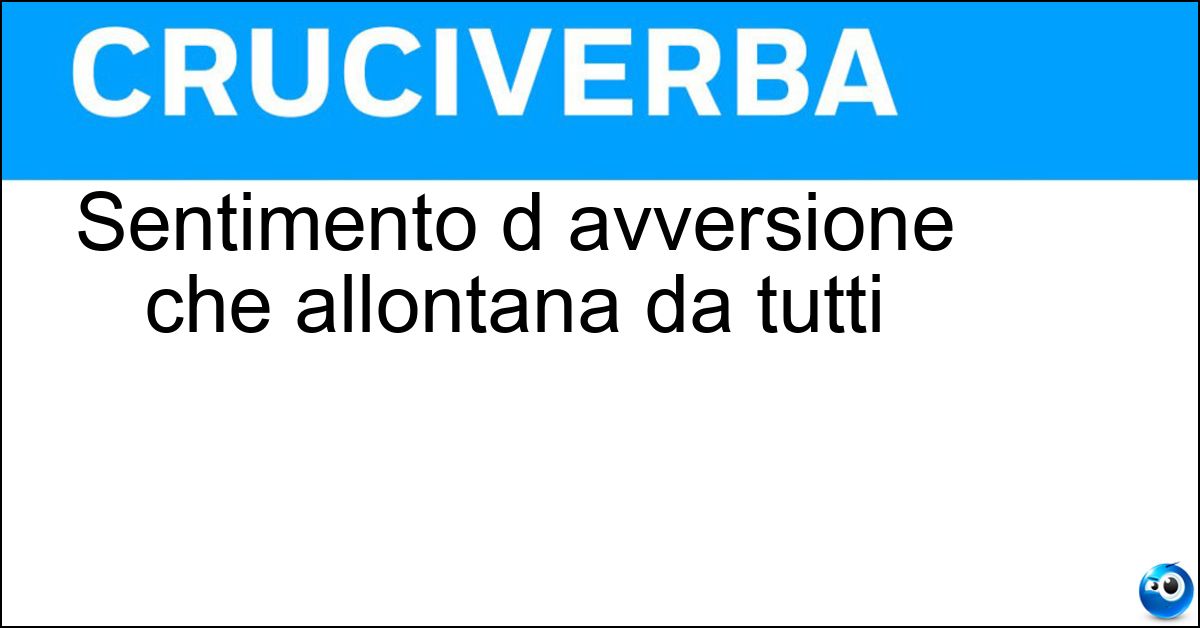 La soluzione di 11 lettere per la definizione 'Sentimento d avversione che allontana da tutti' è 'Misantropia'. Scopri altri termini utili per La Settimana Enigmistica, CodyCross e giochi di parole crociate.