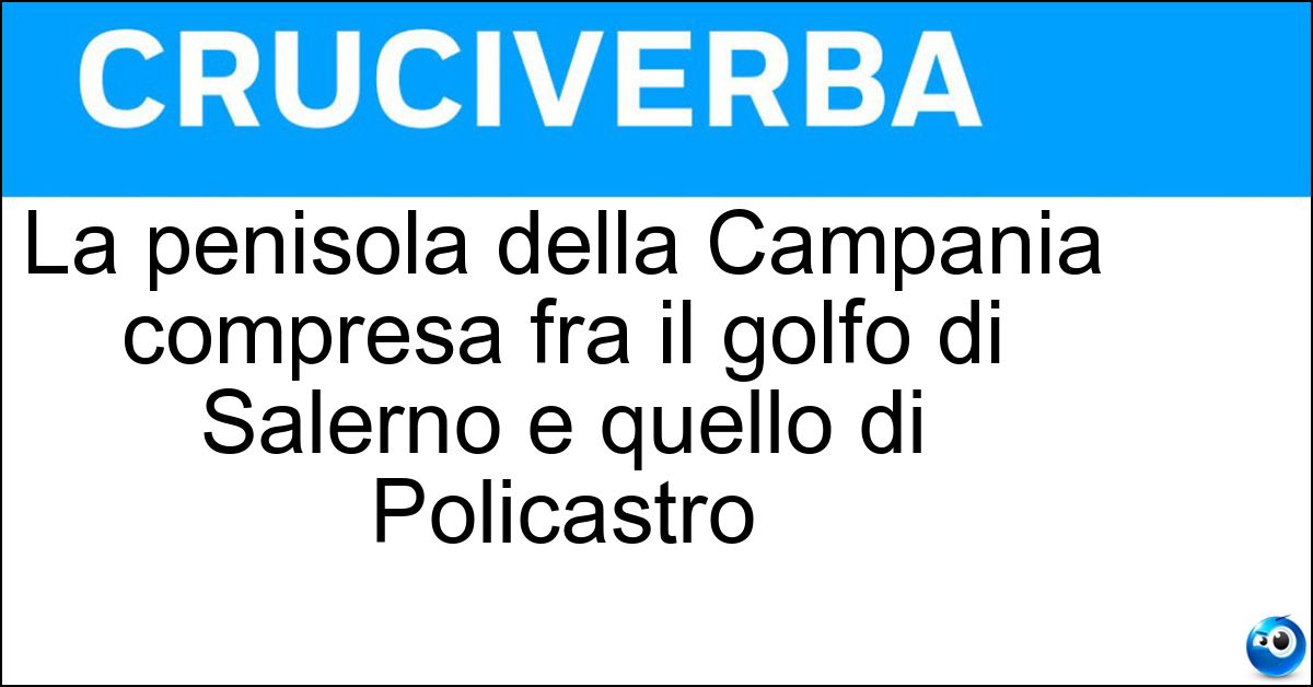 Nei cruciverba e nelle parole crociate, la definizione "La penisola della Campania compresa fra il golfo di Salerno e quello di Policastro" corrisponde a una soluzione formata da 7 lettere. È un quesito ricorrente nel mondo dell’enigmistica, presente con frequenza sia nelle griglie stampate sia nei giochi digitali dedicati agli appassionati.