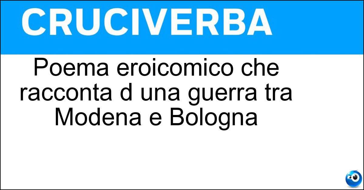 Nei cruciverba e nelle parole crociate, la definizione "Poema eroicomico che racconta d una guerra tra Modena e Bologna" corrisponde a una soluzione formata da 15 lettere. È un quesito ricorrente nel mondo dell’enigmistica, presente con frequenza sia nelle griglie stampate sia nei giochi digitali dedicati agli appassionati.