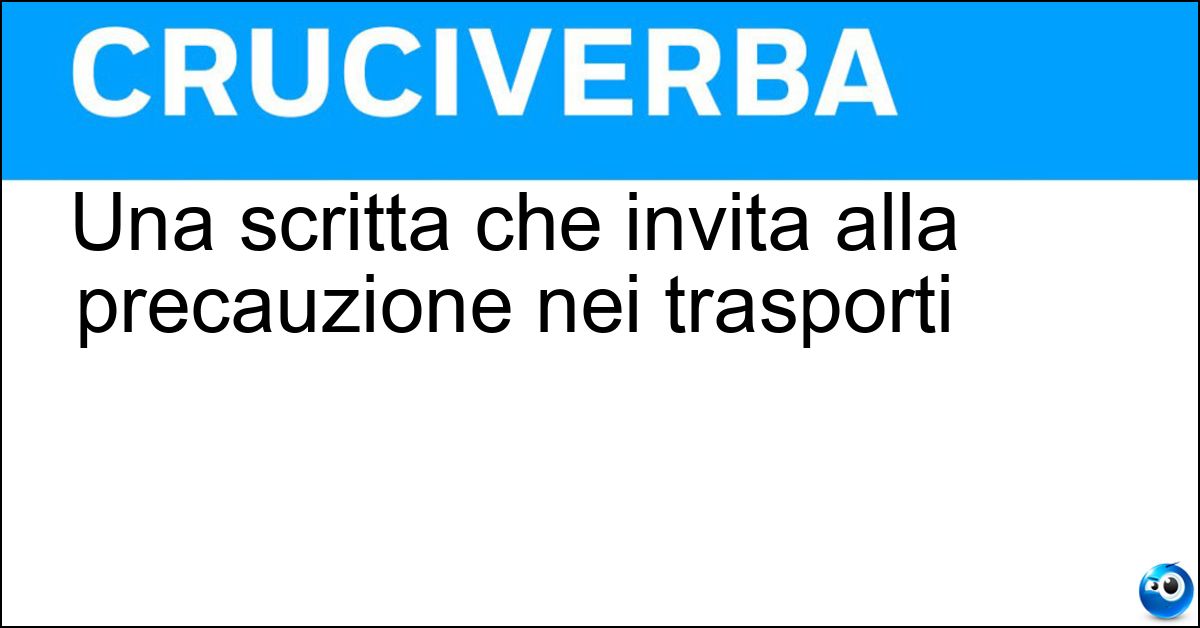 La soluzione di 7 lettere per la definizione 'Una scritta che invita alla precauzione nei trasporti' è 'Fragile'. Scopri altri termini utili per La Settimana Enigmistica, CodyCross e giochi di parole crociate.