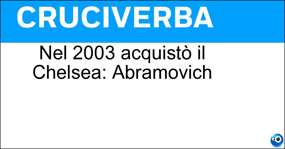 Per risolvere la definizione "Nel 2003 acquistò il Chelsea: Abramovich", in questa pagina trovi la soluzione pronta per l’inserimento nello schema. In alcuni casi, il significato della definizione può variare leggermente in base al cruciverba e alle lettere fornite dagli incroci. Nonostante queste possibili differenze, l’analisi effettuata su "Nel 2003 acquistò il Chelsea: Abramovich" conferma che la soluzione 'Roman' è quella più coerente e compatibile con la maggior parte degli schemi italiani.