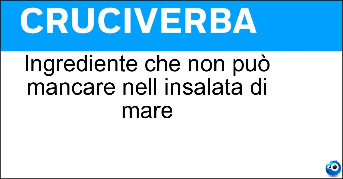 Nei cruciverba e nelle parole crociate, la definizione "Ingrediente che non può mancare nell insalata di mare" corrisponde a una soluzione formata da 5 lettere. È un quesito ricorrente nel mondo dell’enigmistica, presente con frequenza sia nelle griglie stampate sia nei giochi digitali dedicati agli appassionati.